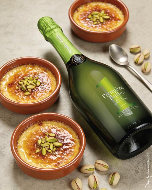 La crème brûlée à la pistache s’accorde avec élégance à la Blanquette de Limoux Première Bulle Bio, dont la fraîcheur et les notes de pomme acidulée du Mauzac viennent équilibrer la douceur de la crème et souligner la finesse de la pistache.